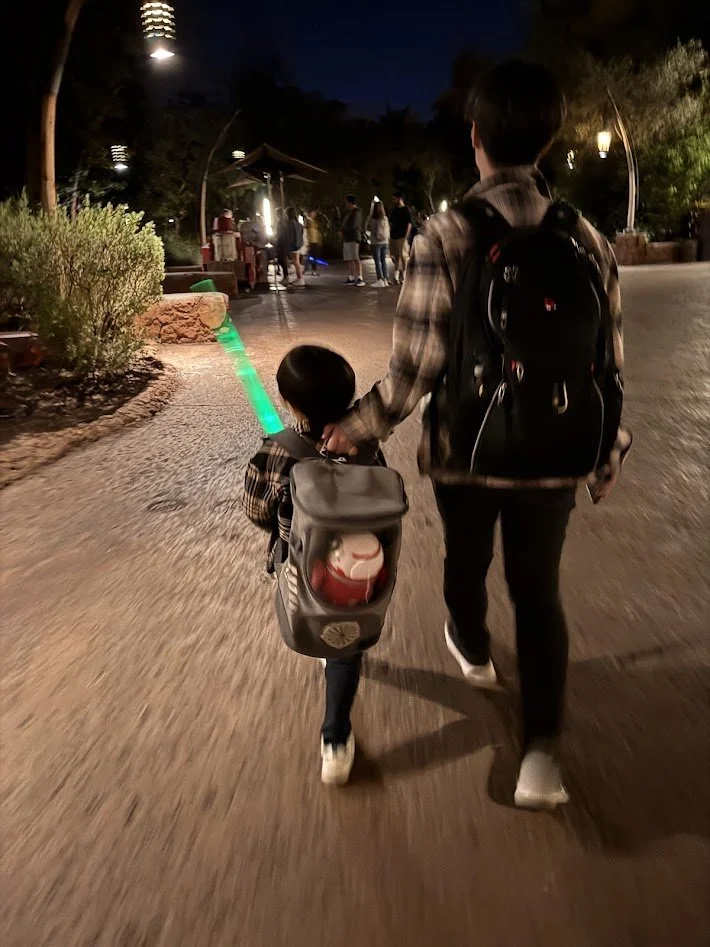After leaving Droid Depot, Eli carried his droid proudly throughout the park. The backpack upgrade made it easy to transport and kept it safe, while also letting him show off his new favorite toy.