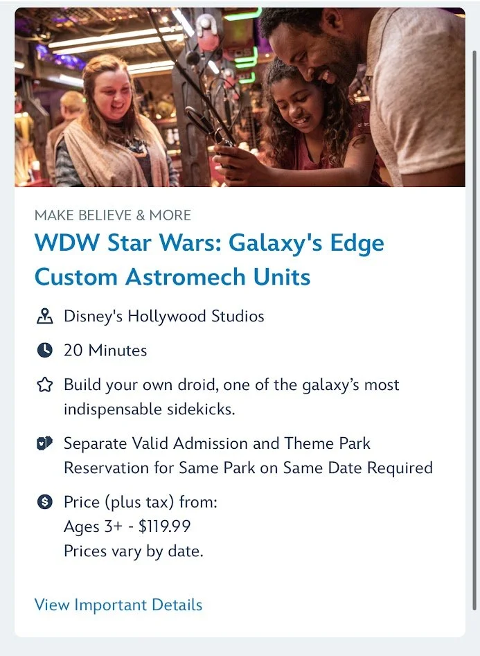 Making an advanced appointment for Droid Depot is recommended, especially during peak times, but when we visited, there were plenty of spots available for walk-ins. Booking is easy through the myDisney App. Simply search “droid depot” to pick the date and time available. If you prefer spontaneity or decide last-minute to build your droid, there’s a good chance you’ll still get in. However, booking ahead ensures you won’t miss out.