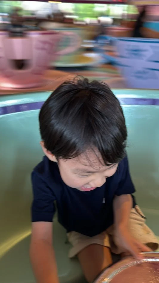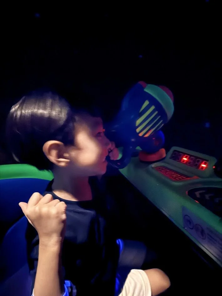 Post-fireworks, we headed to Eli’s favorite ride: Buzz Lightyear’s Space Ranger Spin. With no wait time, we rode it three times in a row. Eli was in his element, firing lasers and racking up points. We ended our night on the Astro Orbiter, which gave us a stunning view of the park under the stars.