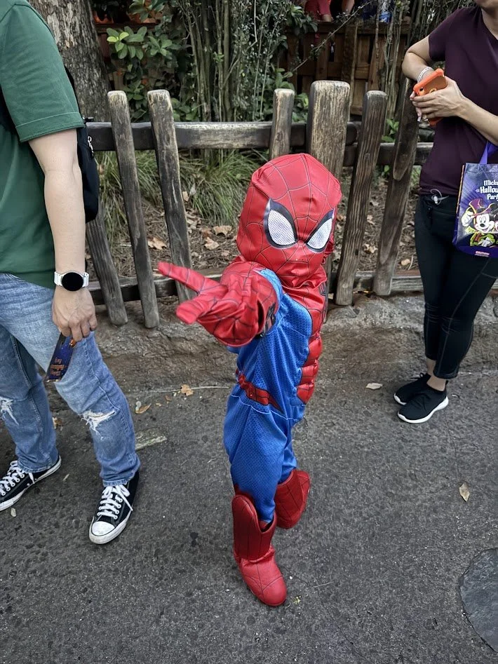 Eli was dressed as Spider-Man, a costume choice that came with its own challenges. It was a hot day, and we had to be mindful of keeping him cool. Upon entering the park, we were given special party bracelets that set us apart from the daytime visitors. The entrance was decked out with bubbles filled with smoke-like water vapor, and Eli spent a few minutes popping them with glee. We each received a trick-or-treat bag and were directed to the right of Main Street to begin our adventure.