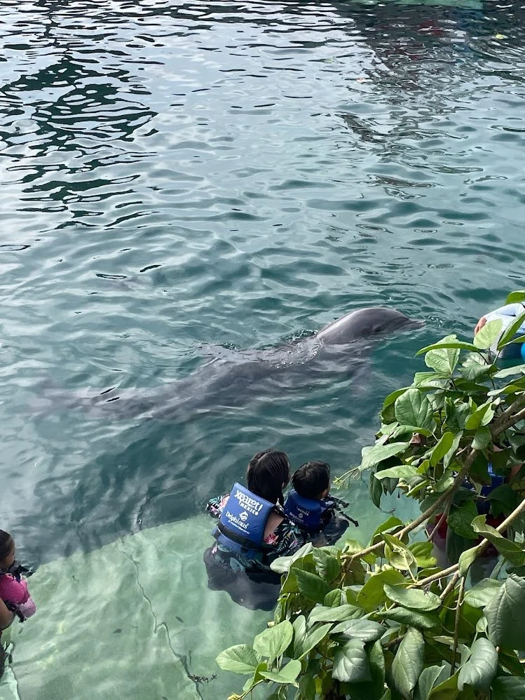 Although the park includes food options, we found ourselves preferring the culinary offerings back at our hotel, choosing to return there for lunch after our morning adventures. However, a standout experience that did capture our hearts was the dolphin interaction. Despite the extra cost, swimming with dolphins was an unforgettable experience for Eli. We opted for the "Interax" program, ideal for his age, which involved a close encounter with these magnificent creatures, including touching and riding on the dolphin's fin.